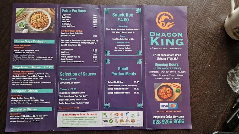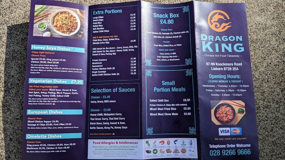 Nestled in Lisburn, Dragon King has become a beloved establishment for locals seeking quality Chinese cuisine. The location is easily accessible with a wheelchair-friendly entrance and ample parking outside, allowing effortless pickup for takeaway orders or convenient access for diners. The vibrant neighborhood buzzes with energy, making it an ideal spot to grab dinner or enjoy a leisurely meal with friends. During the weekdays, the restaurant maintains a steady stream of customers, emphasizing its popularity within the community. Whether you are a long-time resident or just passing through, Dragon King's welcoming atmosphere invites everyone to indulge in a flavorful culinary experience. The establishment's commitment to high-quality food and friendly service consistently shines through, making it a go-to destination for satisfying Chinese food cravings.